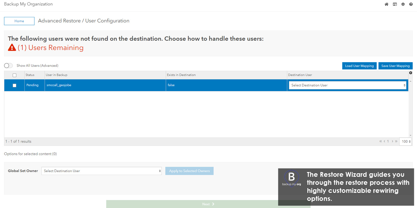 Our famous Cloning workflow has been vastly improved to allow users greater access and stability when migrating or promoting their items, users, and groups between their licensed ArcGIS® connectors in Backup My Org. Included is a smart restore wizard to assist in rewiring your items, users, and groups if there is missing information on the destination.